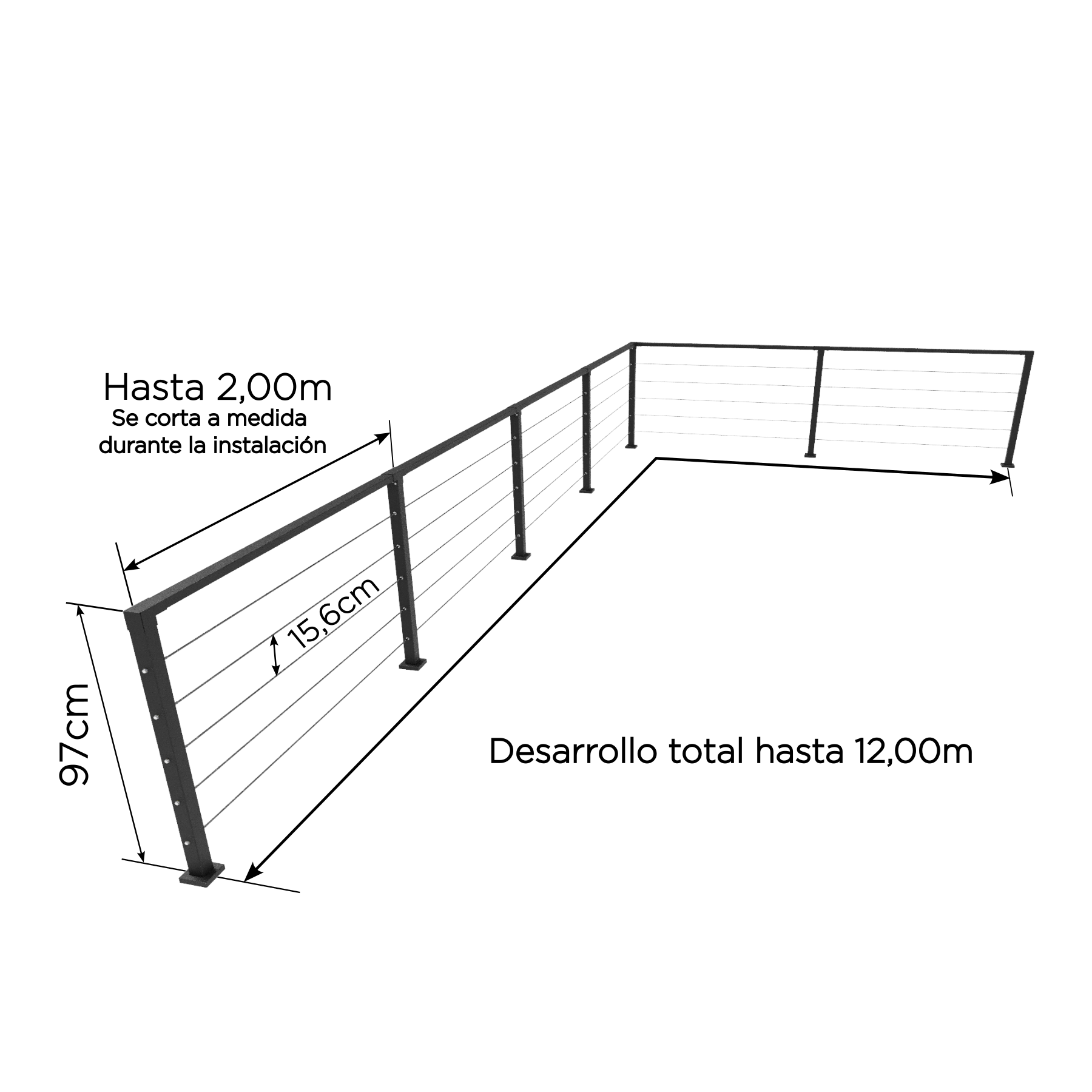 Materiales premium: Tensores de aluminio anodizado, cable de acero galvanizado y bulonería de acero inoxidable.