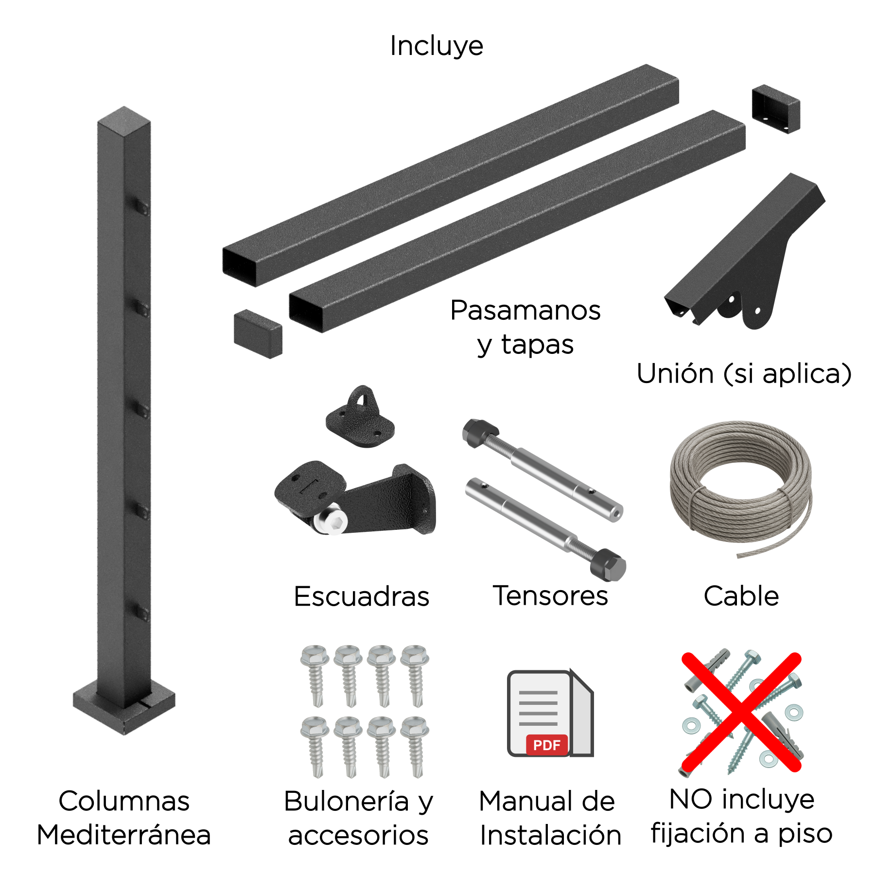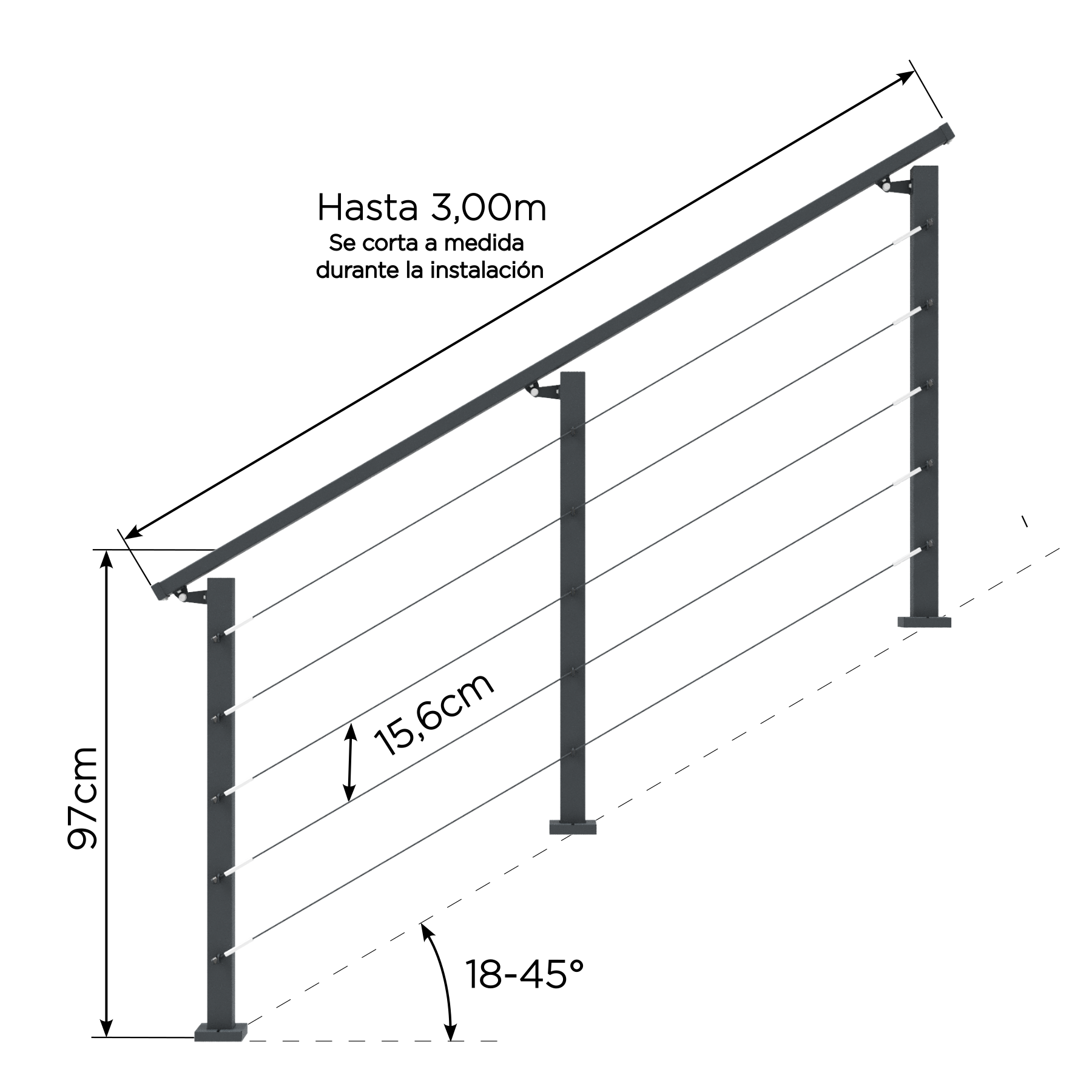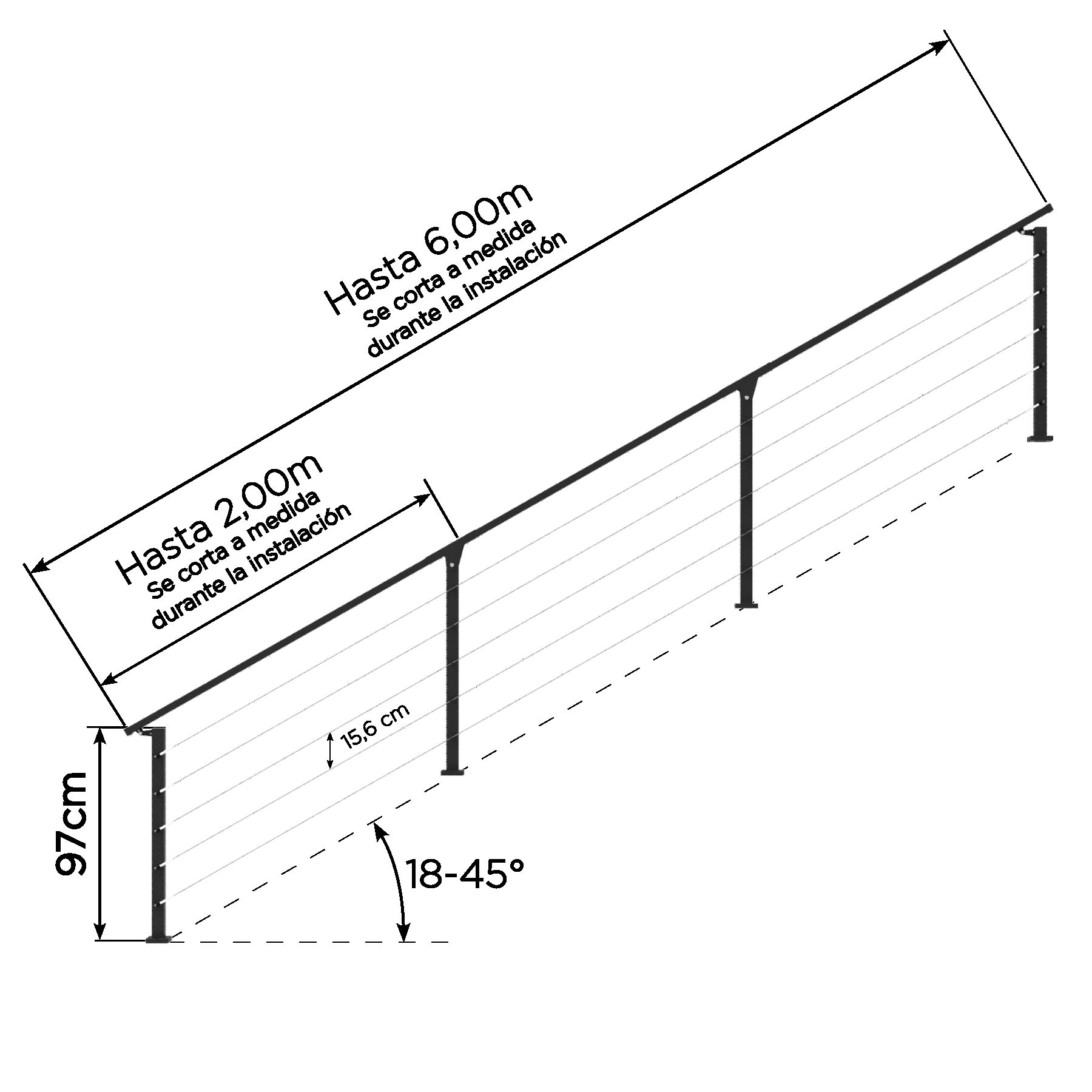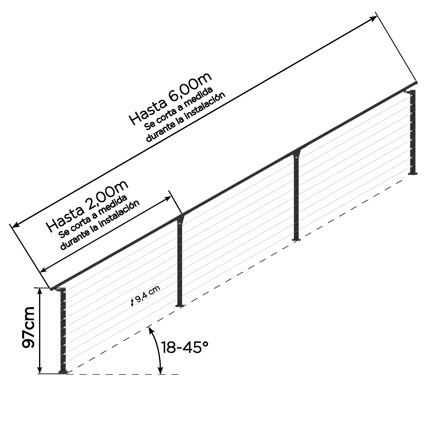 Materiales premium: Tensores de aluminio anodizado, cable de acero galvanizado y bulonería de acero inoxidable.