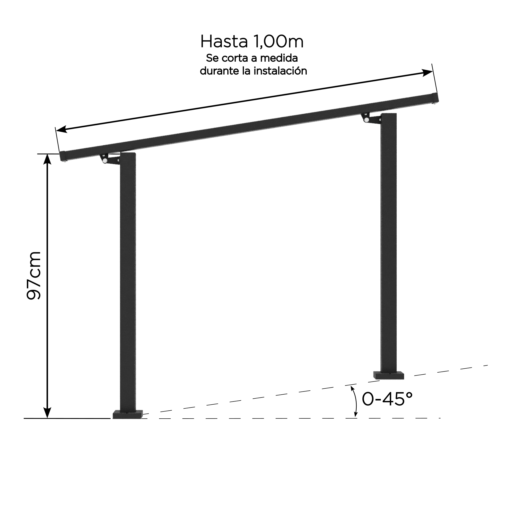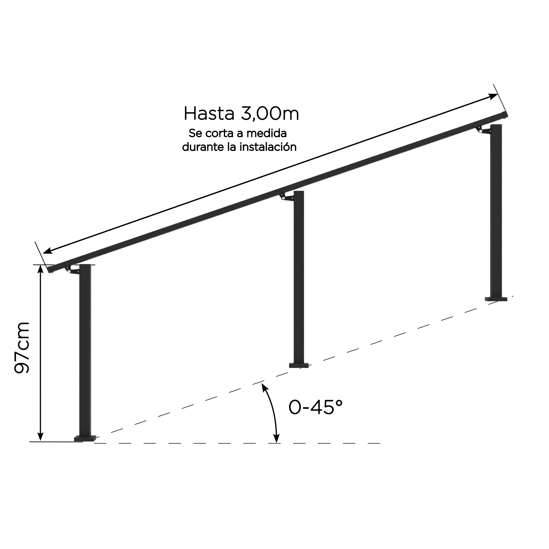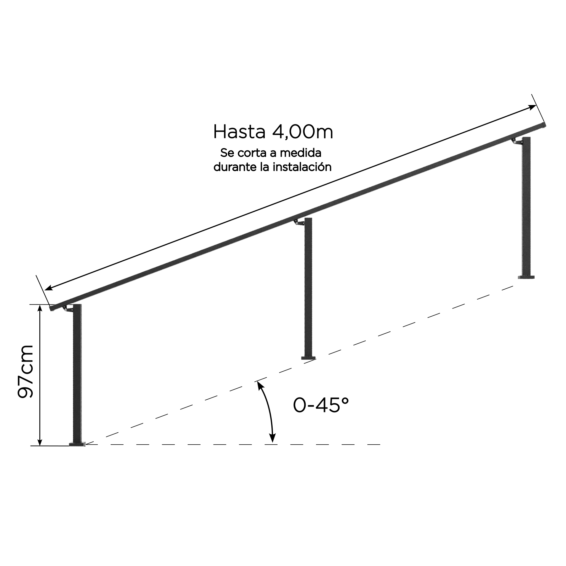 Diseñada para rampas, escaleras y diversos accesos, la baranda combina seguridad, estética y durabilidad. Con 97 cm de altura y ajuste de inclinación entre 18° y 45°, se adapta a distintos proyectos.